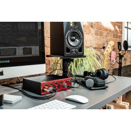 Les quatre préamplis micro Clarett+, avec une grande quantité de Headroom, un bruit et une distorsion ultra-faible — équipés de la fonction Air analogique avec commutation d’impédance et contrôle par relais — enregistrent les voix, les drums et les instruments acoustiques avec une clarté inégalée. Les deux entrées instrument JFET vous permettent de vous brancher directement et de préserver le son naturel de votre guitare, comme si vous la branchiez à un ampli.