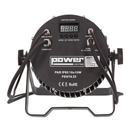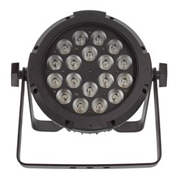 Projecteur IP65 à LED Power Lighting de type Wash comprenant 18 LEDs de 10W 5-en-1 (RGBWA). Coque en aluminium moulée. Nouvelle technologie de gradation électronique (PWM) éliminant les scintillements. Ouverture du faisceau à 25°. Utilisation en mode DMX, musical ou automatique. Idéal pour des installations ou prestations extérieures. Format compact, d’une grande robustesse et ultra silencieux.
